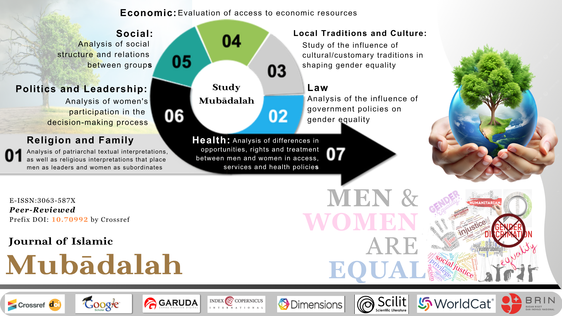 Journal of Islamic Mubadalah publishes high-quality scholarly articles that analyze issues of human inequality, such as the differences in roles between men and women in the context of religion, family, legal provisions, local cultural traditions, economic disparities, social inequality, and leadership. The issue of human inequality is analyzed using the theory of mubādalah, which emphasizes the principles of balanced human relationships, equal partnerships, mutuality, and collaboration. Mubādalah views men and women as equal subjects, thereby granting both parties the same rights and opportunities to participate in various fields. Mubādalah analysis is crucial in efforts to achieve gender equality and justice across different sectors of life. This journal specializes in the science of human equality, which holds significant global relevance in line with the United Nations' Sustainable Development Goals (SDGs).